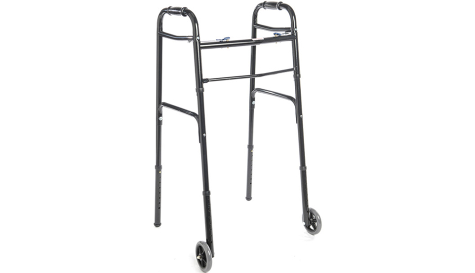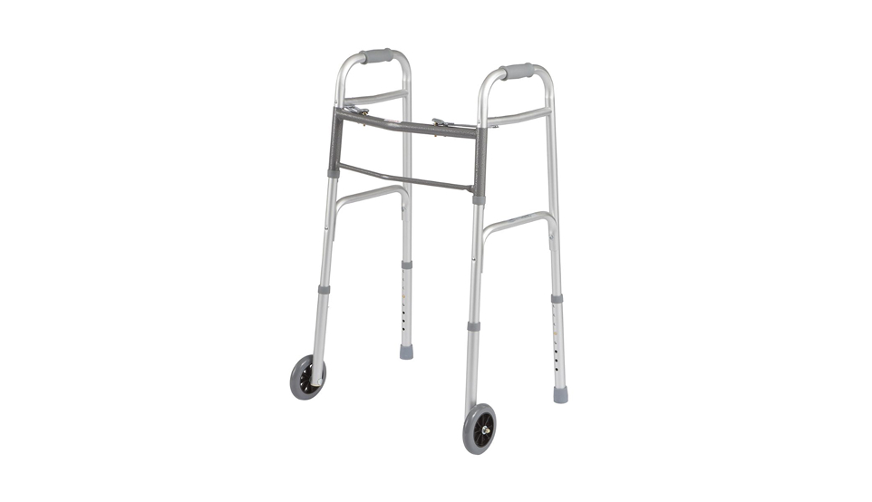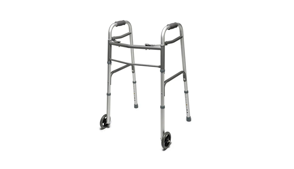 This 2-Button Folding Walker features 5" wheels for smooth mobility. Its lightweight design and easy folding mechanism make it perfect for users seeking stability and convenience on the go.
